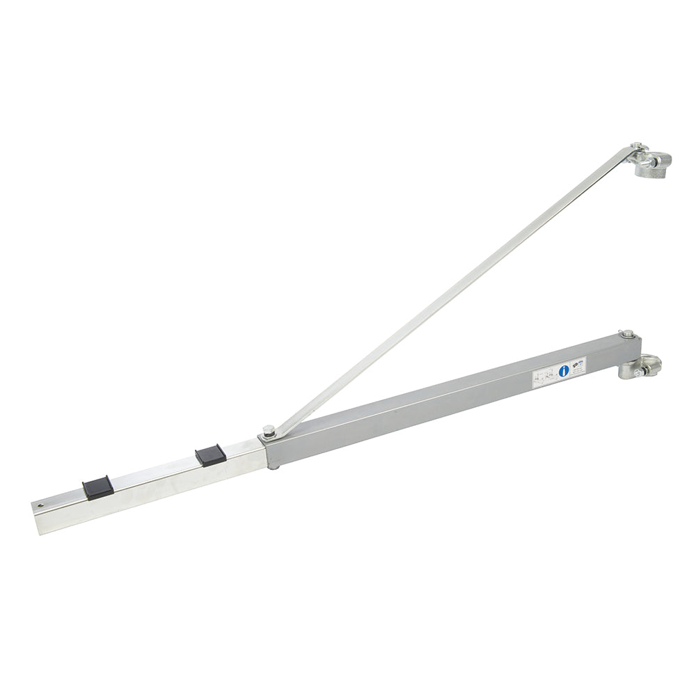 Sturdy hoist support frame with 43mm square tubing for mounting an electric hoist. 180° angle adjustment across the horizontal plane. 1.1m maximum extension from the mounting surface. 600kg maximum load. Secures to 48.3mm diameter scaffolding tubes. For use with Silverline 500W Electric Hoist 250kg and Silverline 900W Electric Hoist 500kg.